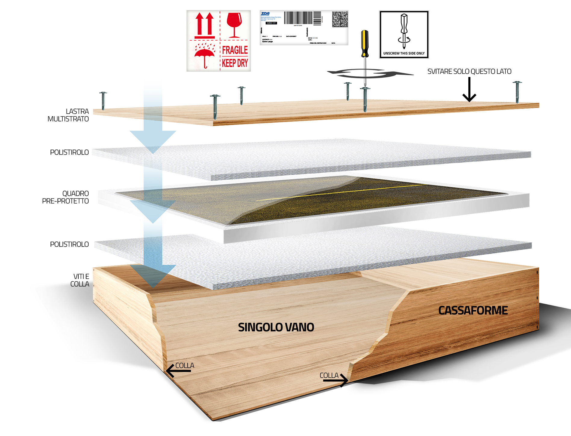 Per la spedizione il quadro viene accuratamente avvolto prima in più strati di film a bolle d’aria e successivamente in un film trasparente estendibile dal lato interno con capacità adesiva. L’involucro che si crea garantisce la prima protezione agli urti, all’acqua o all’umidità. Due strati di polistirolo espanso vengono posizionati sui due lati dell’involucro e infine il quadro così protetto viene inserito nella cassaforme in legno. La cassaforme in legno garantisce l’ultima e ulteriore protezione dell’opera. Rigida e resistente agli urti, riporterà indicate all’esterno tutte le informazioni necessarie perché sia garantito e tenuto in considerazione: il verso di trasporto, la fragilità del contenuto, il lato di apertura della cassaforme e i documenti di trasporto del vettore.
